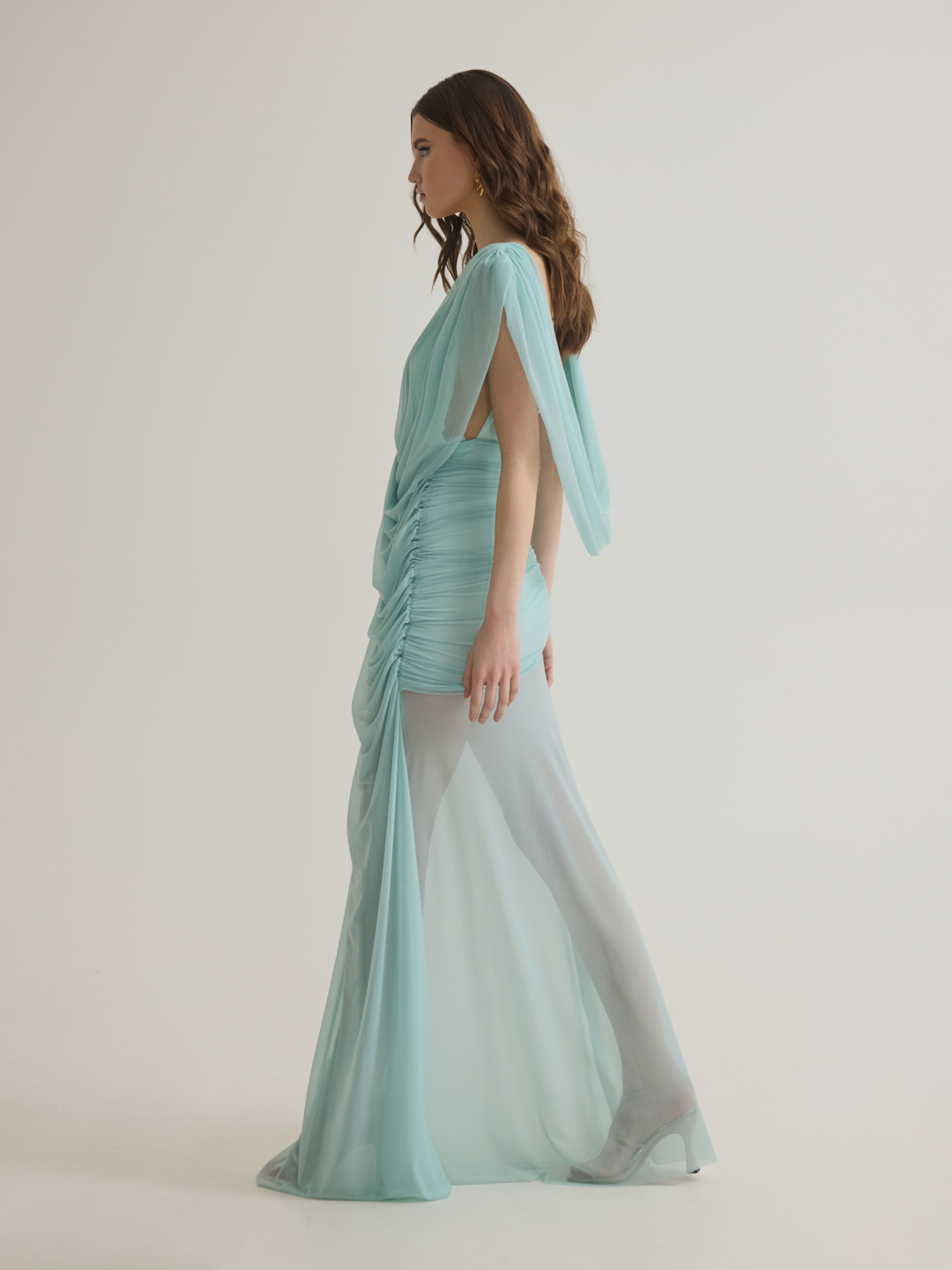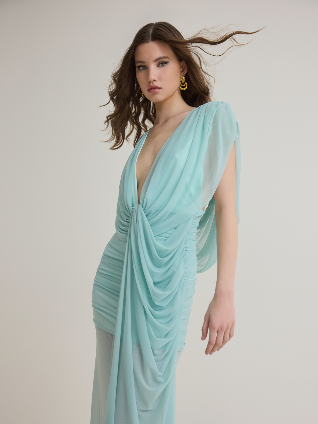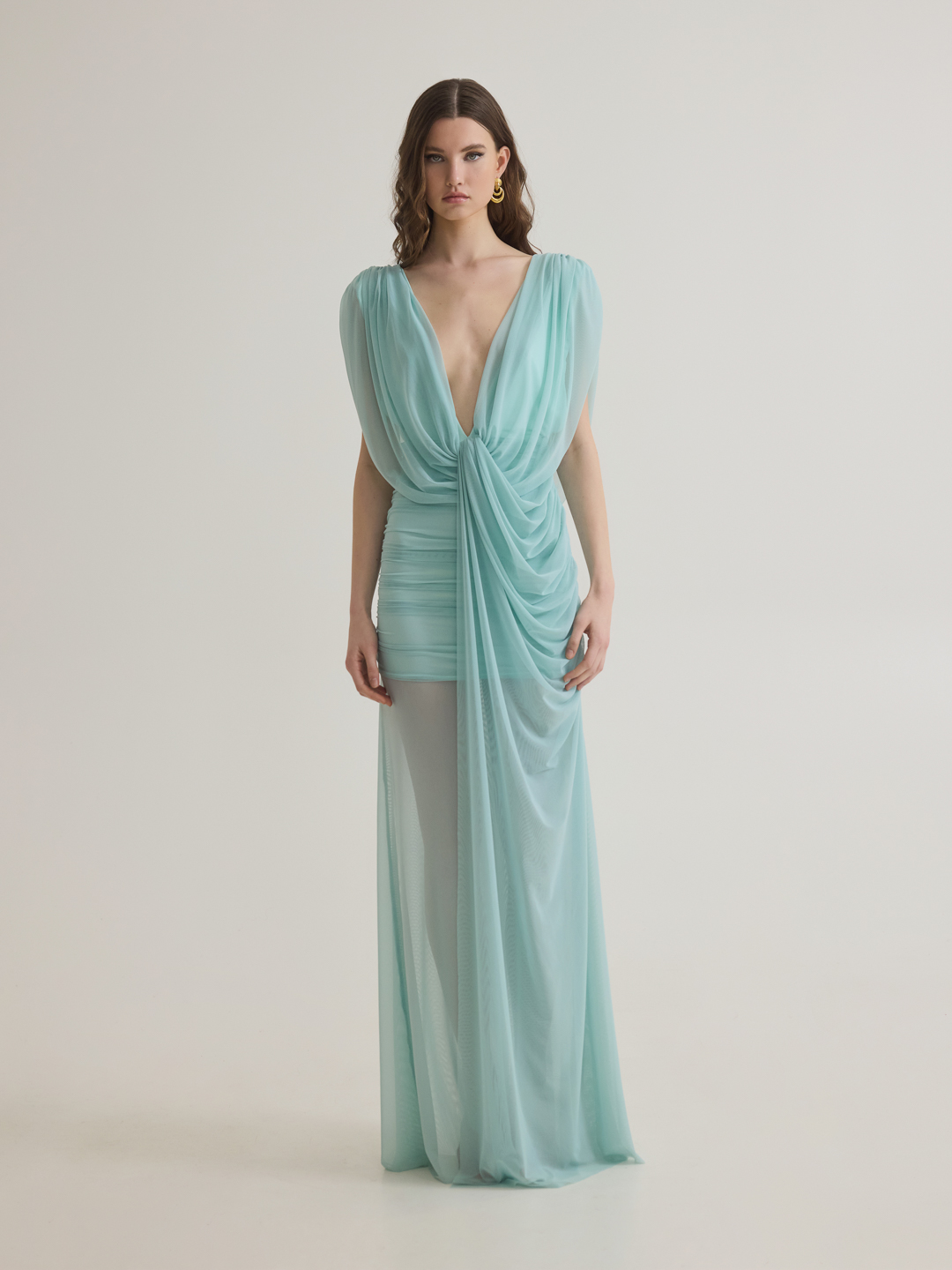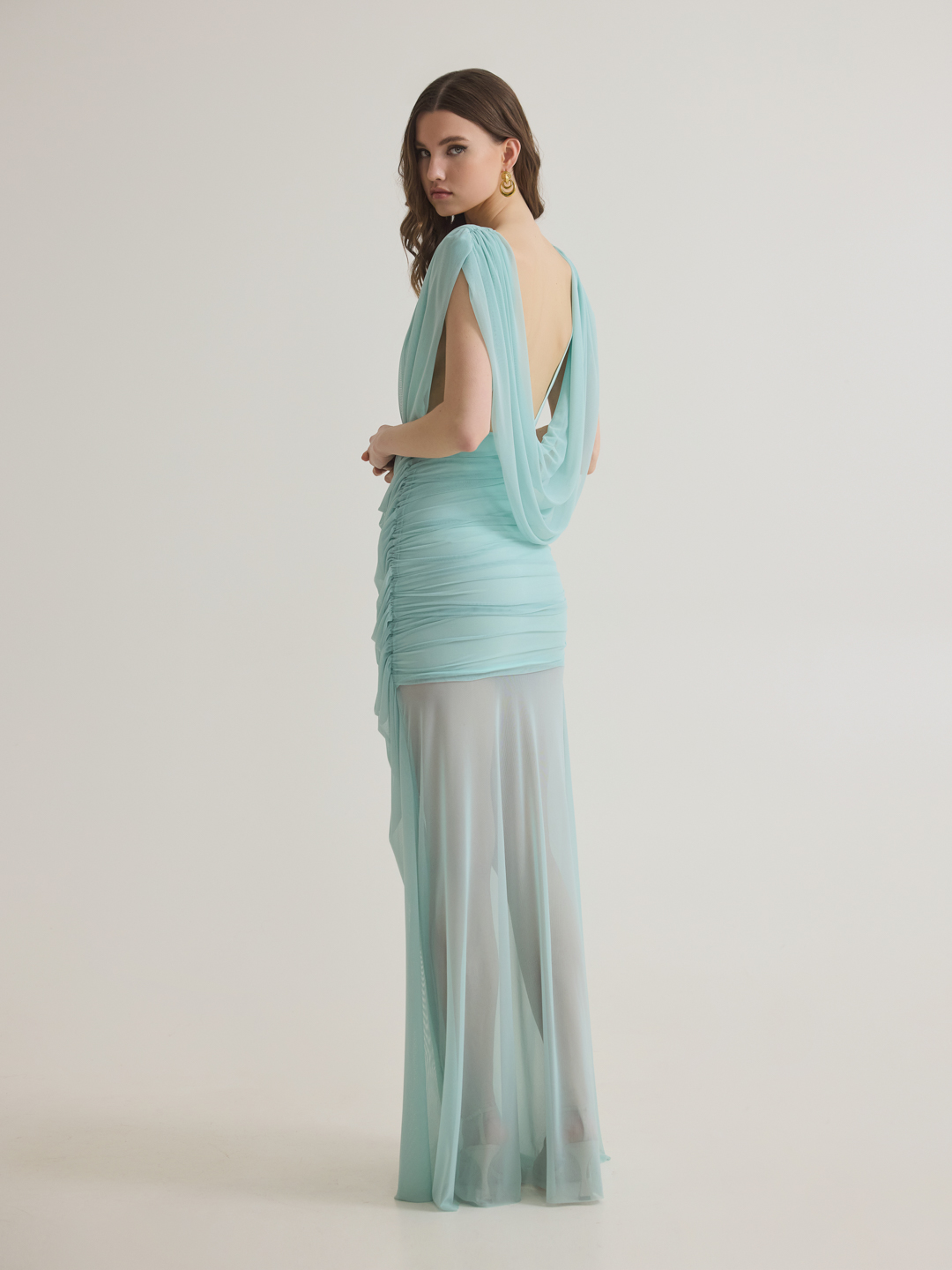 To maxi εξώπλατο ντραπέ φόρεμα με πτυχώσεις Azalea της ÉCLORE Collection είναι διαθέσιμο στα χρώματα Mint (μέντα) και Misty Rose (ροζ).