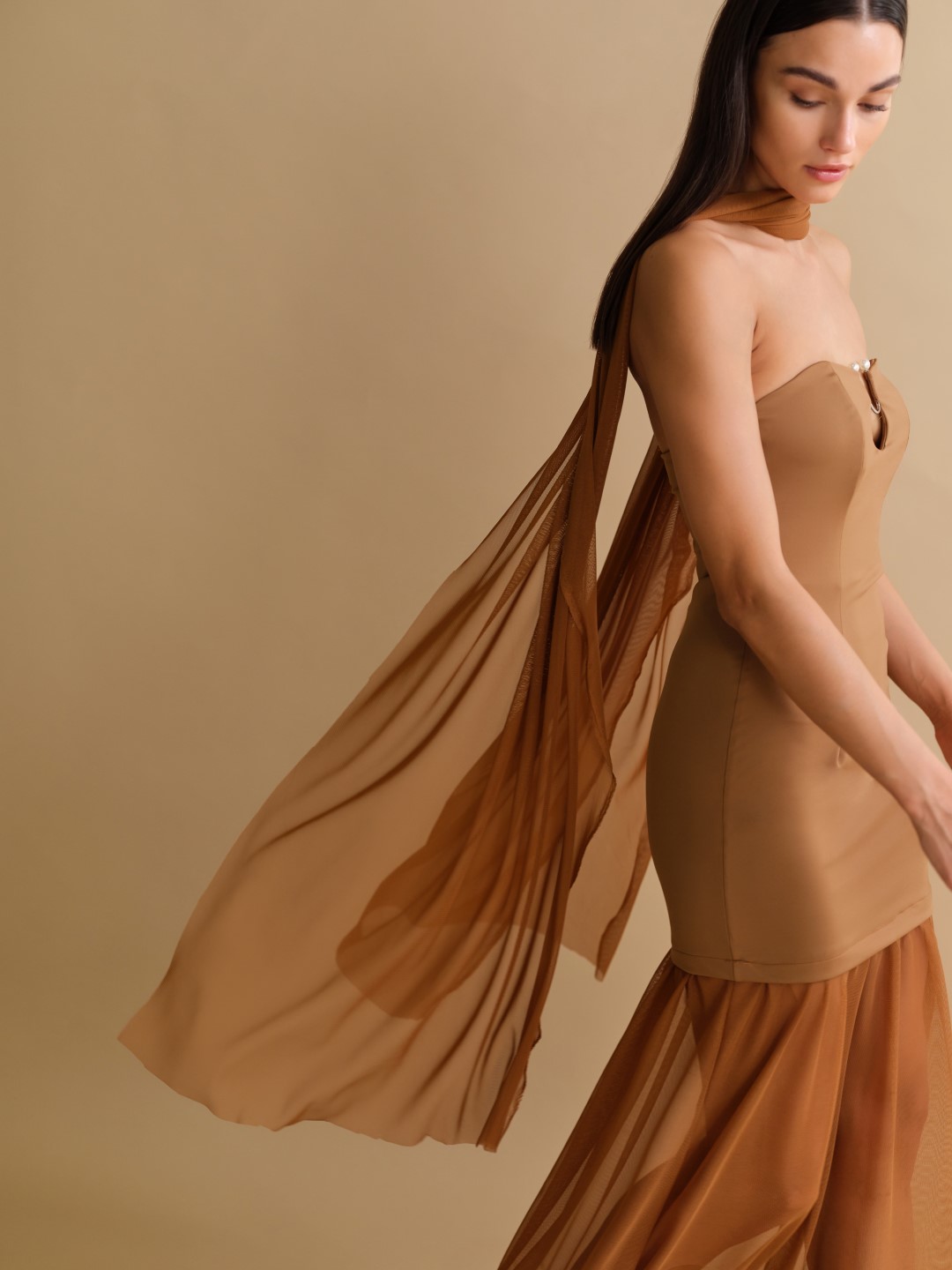 Strapless βραδινό μακρύ φόρεμα σε δύο επίπεδα, με τούλινο τελείωμα και τούλινο αέρινο φουλάρι. Ένα φόρεμα που αποπνέει ρομαντισμό και πολυτέλεια. Το στράπλες ντεκολτέ αναδεικνύει τους ώμους με θηλυκή κομψότητα, ενώ το ασημί απλικέ με την πέρλα στο φινίρισμα λειτουργεί σαν ενσωματωμένο statement accessory που απογειώνει το look. Η φούστα καταλήγει σε ανάλαφρες στρώσεις από τούλινο ύφασμα, που προσδίδουν διάσταση και κίνηση σε κάθε βήμα. Παράληλα, το τούλινο φουλάρι αγκαλιάζει απαλά τους ώμους ή αφήνεται να πέσει χαλαρά, προσφέροντας ευελιξία στο styling και έναν αέρα ρομαντικής κίνησης.