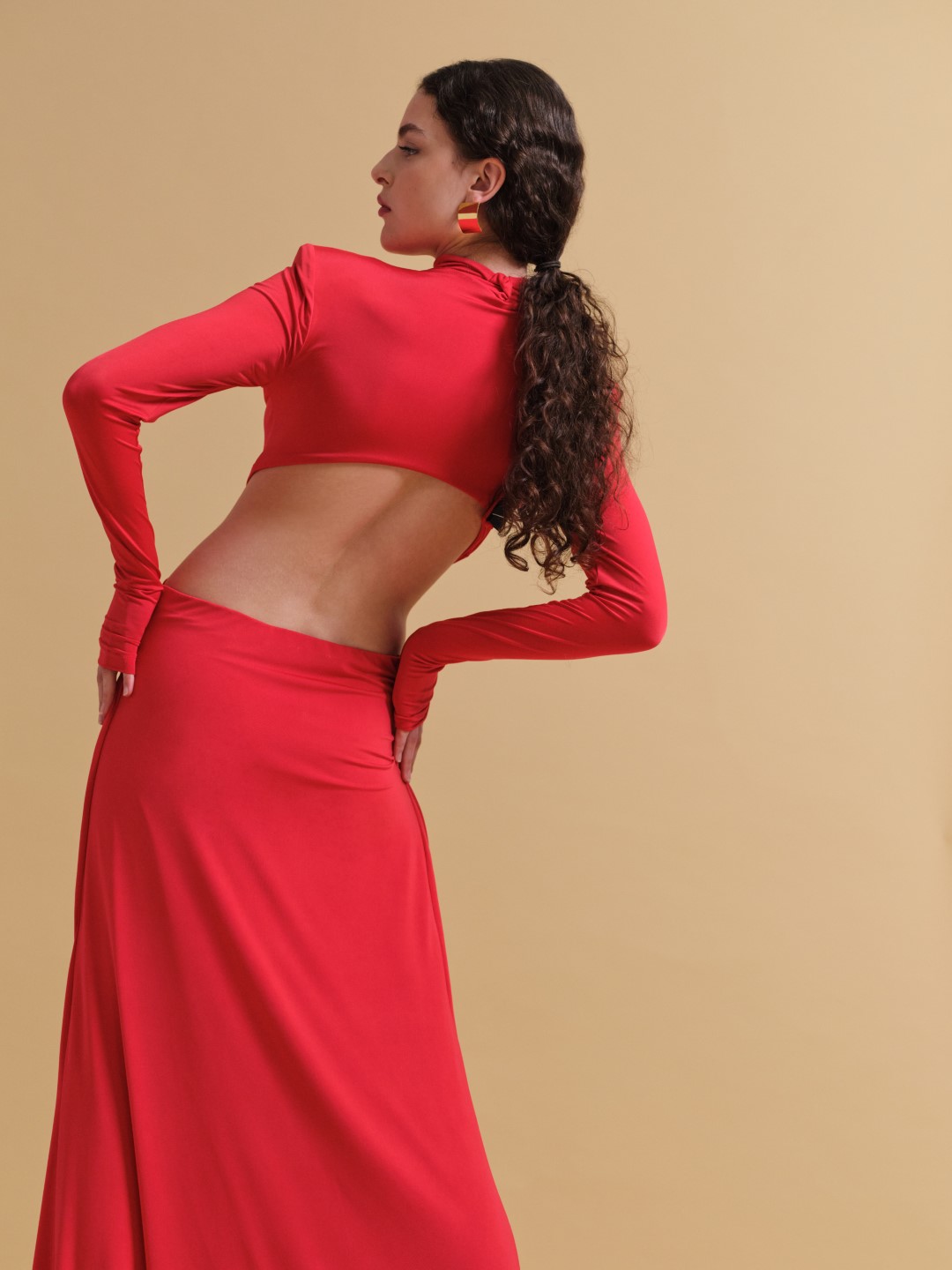 Kόκκινο Maxi Εξώπλατο Φόρεμα, Μακρυμάνικο με Μύτη στο Τελείωμα του Κορμού και Ντραπέ Κάτω Μέρος, ένα κομψό και αριστοκρατικό κομμάτι που συνδυάζει τη διαχρονική φινέτσα με τη μοντέρνα αισθητική. Ιδανικό για βραδινές χριστουγεννιάτικες εμφανίσεις, ρεβεγιόν, γιορτινά, επίσημα events, εντυπωσιακές εμφανίσεις και ιδιαίτερες περιστάσεις όπου το στυλ και η θηλυκότητα πρωταγωνιστούν.