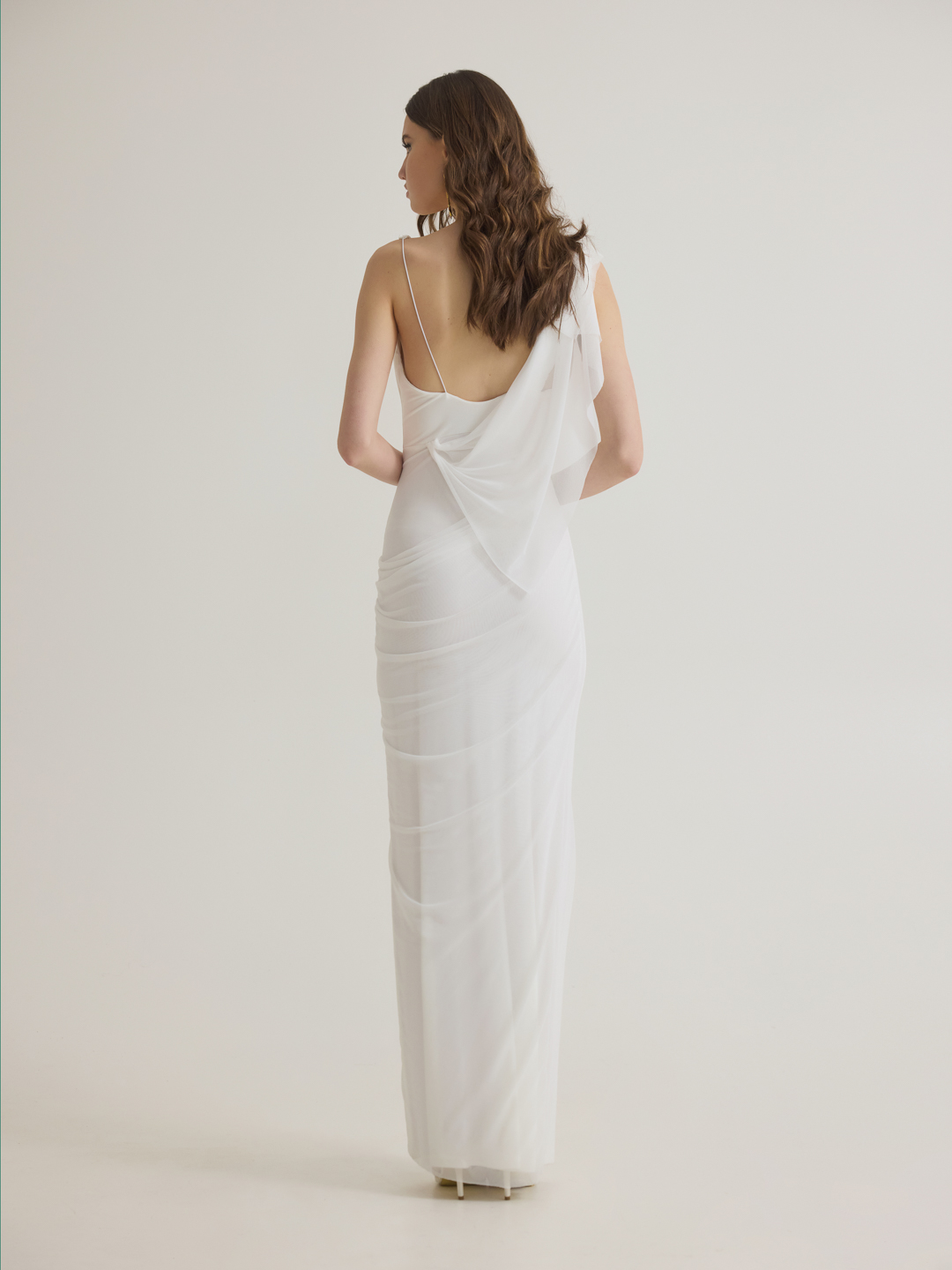 Maxi φόρεμα με πτυχώσεις από τούλι, λεπτές τιράντες και διακριτικά ανοιχτή πλάτη. Ένα θηλυκό και εντυπωσιακό κομμάτι που ξεχωρίζει για την κίνηση και τη ροή του.