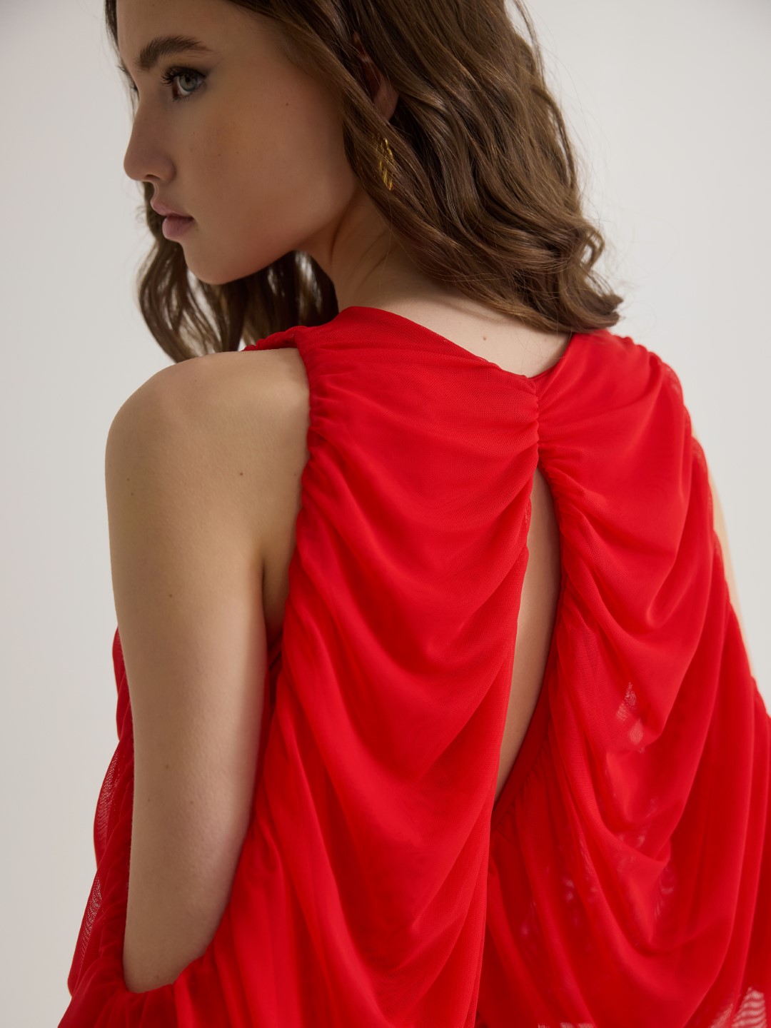 - Έξω ώμοι με αέρινο τούλινο ντραπέ κομμάτι που πέφτει στους αγκώνες
