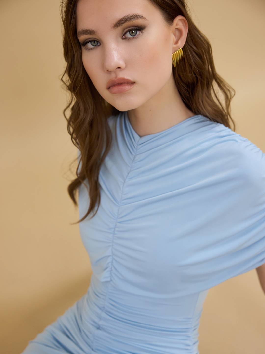 Μίνι φόρεμα με μπέρτα και σούρες, ένα θηλυκό και μοντέρνο κομμάτι που αναδεικνύει τη σιλουέτα με άνετο και κολακευτικό τρόπο. Οι σούρες αγκαλιάζουν αρμονικά το σώμα, δημιουργώντας ένα καλοσχηματισμένο αποτέλεσμα που τονίζει τις γραμμές χωρίς να περιορίζει την κίνηση.