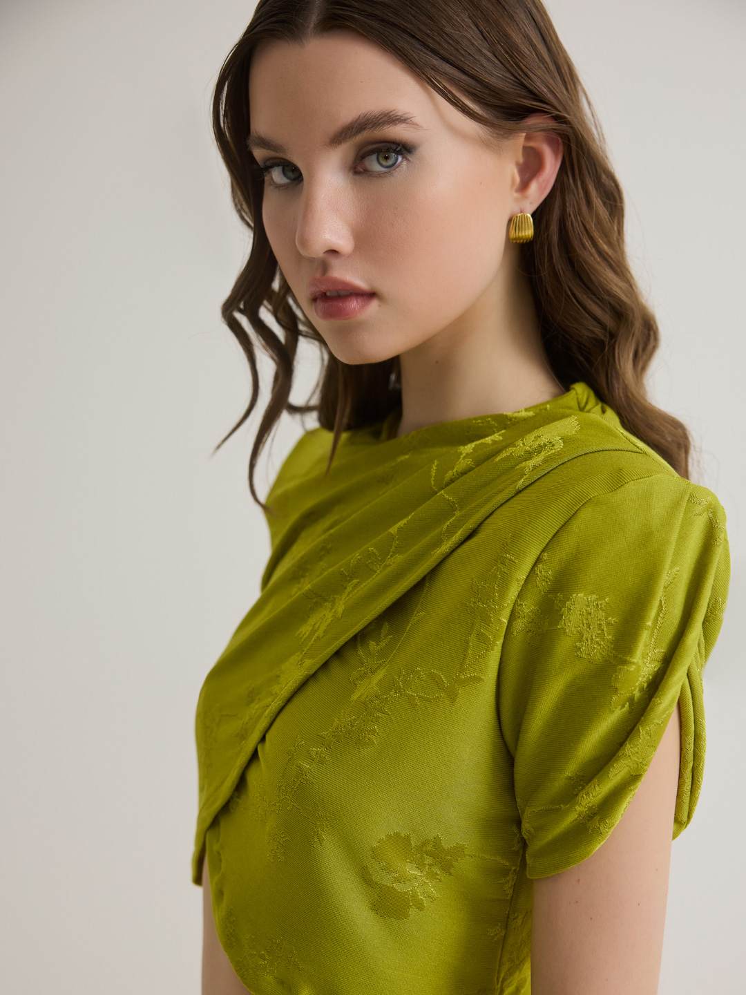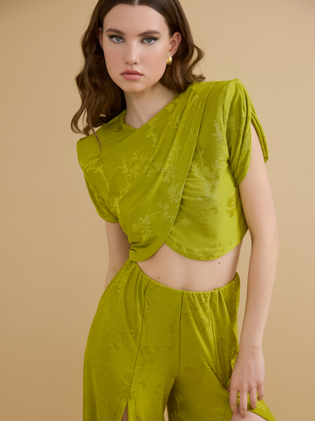 Το κοντομάνικο τοπ PANSY της SOLIA COLLECTION μπορεί να συνδυαστεί άψογα με την mini φούστα SALVIA ή την ψηλόμεση παντελόνια PEONY σε lime.