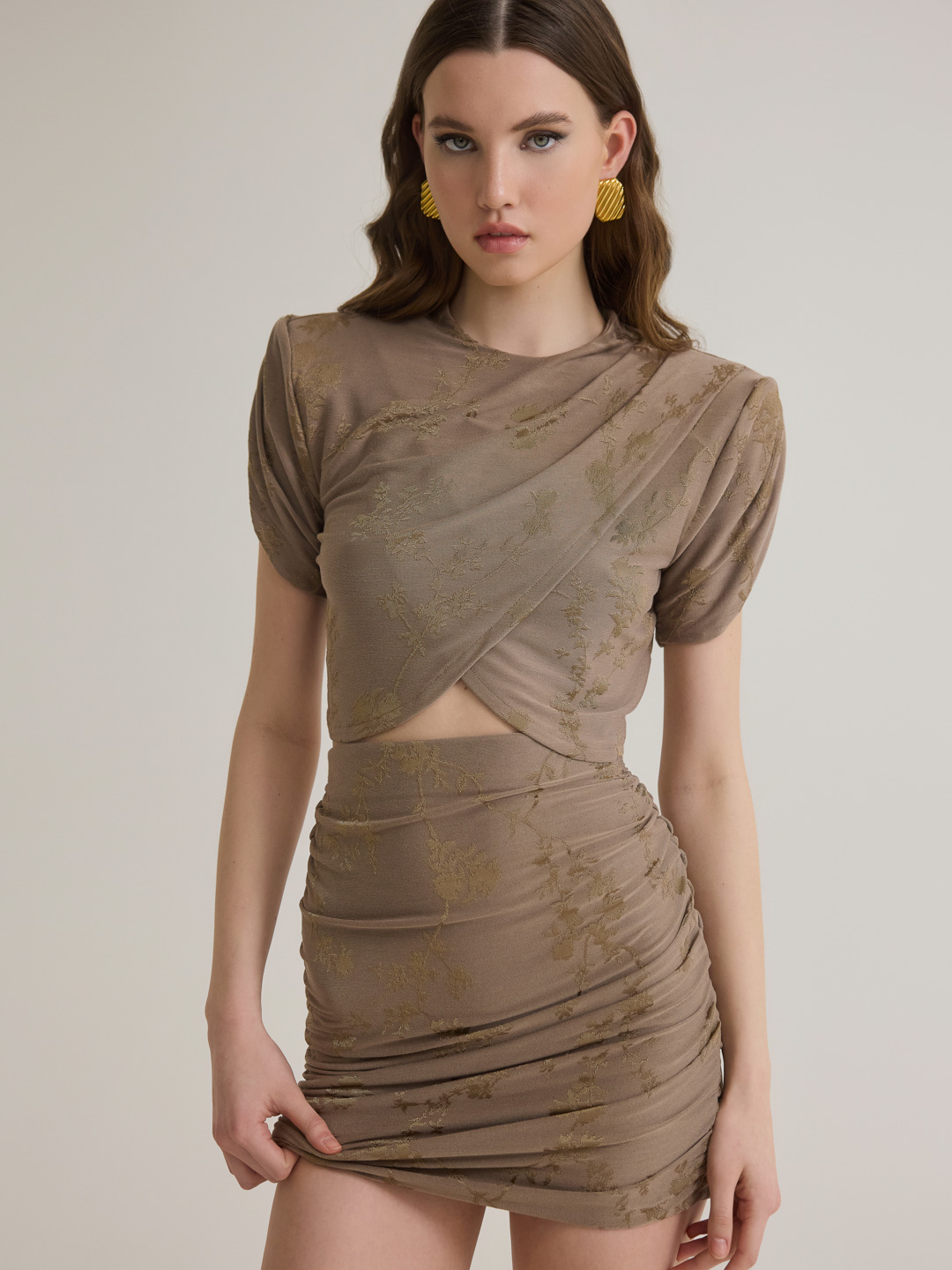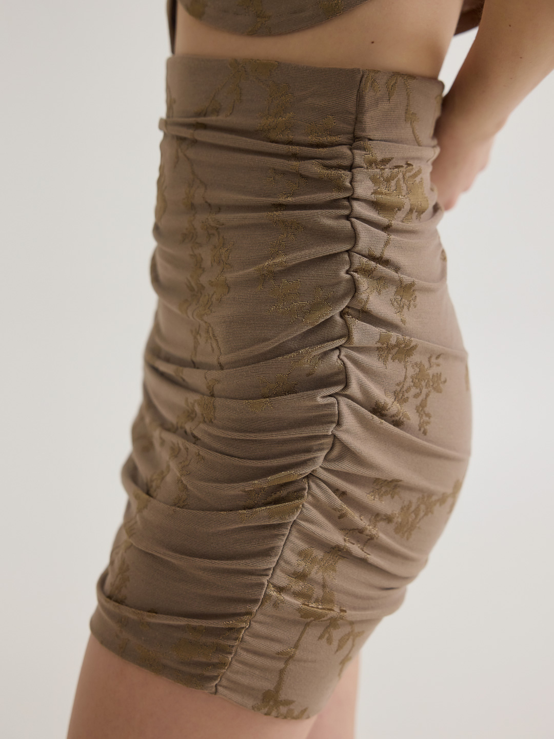 Η mini skirt SALVIA της SOLIA COLLECTION μπορεί να συνδυαστεί άψογα με το ΖΙΝΝΙΑ ντραπε top ή το PANSY κοντομάνικο top σε mocha .