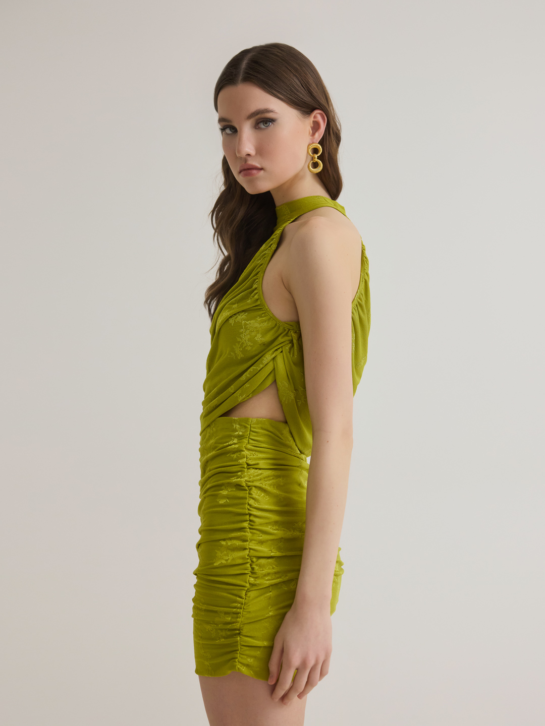 Η mini φούστα SALVIA της SOLIA COLLECTION μπορεί να συνδυαστεί άψογα με το ΖΙΝΝΙΑ ντραπε top ή το PANSY κοντομάνικο top σε lime.
