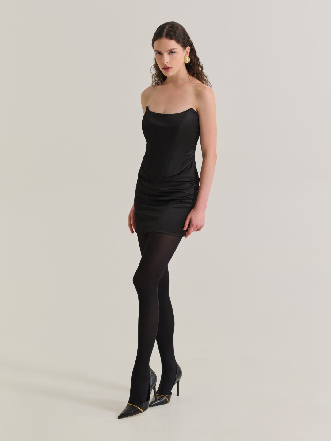 Μίνι σατέν φόρεμα με κορσέ στο πάνω μέρος , ένα εκλεπτυσμένο και δυναμικό κομμάτι που συνδυάζει τη θηλυκή γραμμή με τη μοντέρνα αισθητική. Ιδανικό για βραδινές εμφανίσεις, parties και ιδιαίτερες περιστάσεις όπου η κομψότητα και η αυτοπεποίθηση πρωταγωνιστούν.