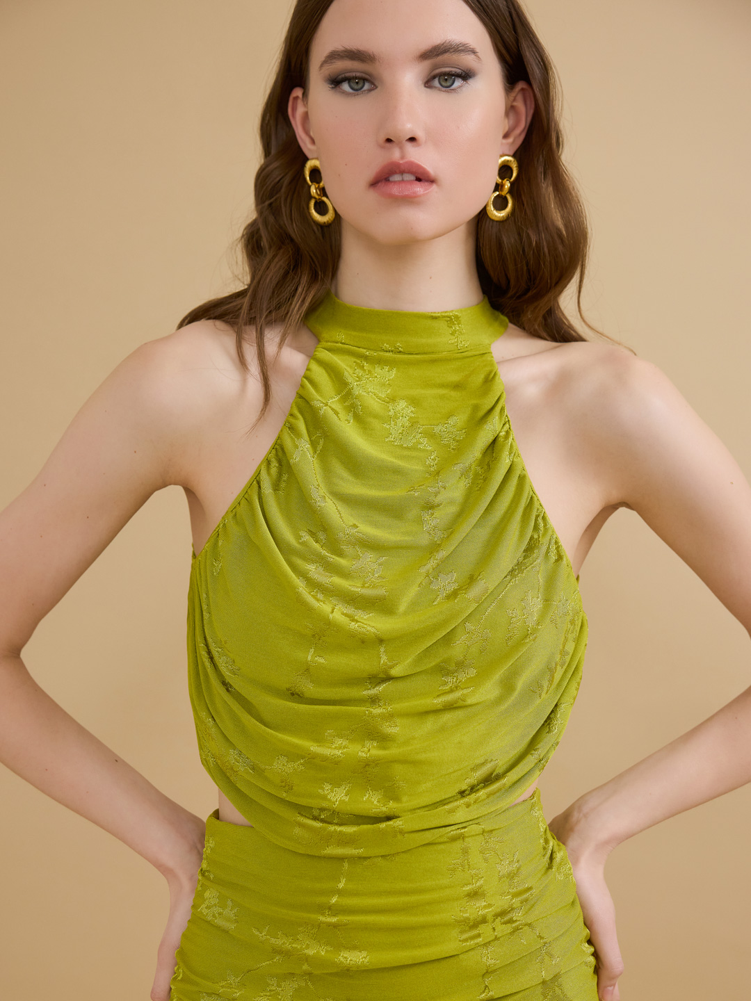 Το ντραπε τοπ ZINNIA της SOLIA COLLECTION μπορεί να συνδυαστεί άψογα με την mini φούστα SALVIA ή την ψηλόμεση παντελόνια PEONY σε lime.